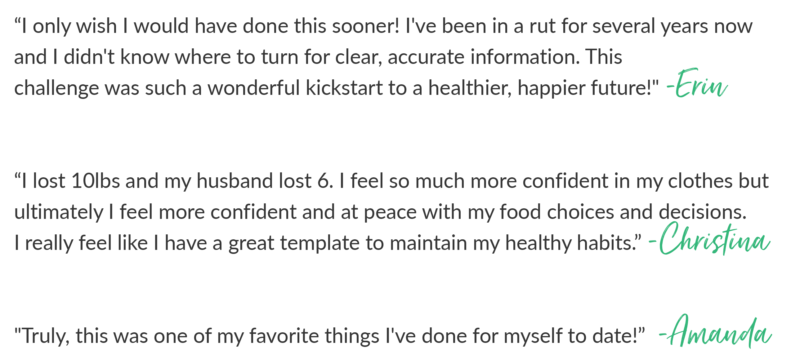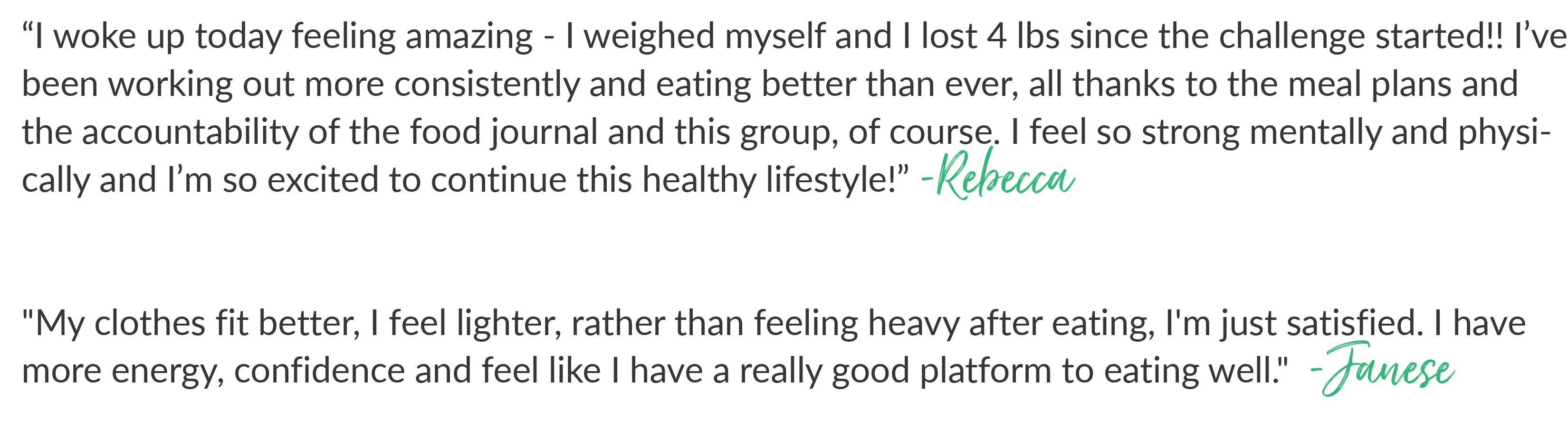 "This challenge transformed me both mentally and physically. Mentally, the way I thought about food and the way I treated my body completely changed. Instead of depriving myself, I upgraded. Instead of making not-so-loving comments about my body every day, I thanked good food and exercise. My clothes fit better, I lost weight, and I noticed a difference in my photos, my confidence, and my energy level! I will continue the habits I learned for the rest of my life!"